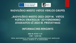 Naujiena 2026-03-16 KVIEČIAME Į INFORMACINĮ RENGINĮ VIETOS PLĖTROS STRATEGIJOS ATASKAITOS UŽ 2025 METUS PRISTATYMAS Skaityti daugiau» 2026-03-08