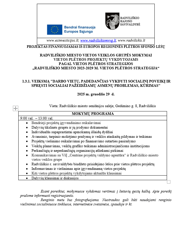 KVIETIMAS Nr. 11-240-K https://2021.esinvesticijos.lt/kvietimai/bendruju-socialiniu-ir-sociokulturiniu-paslaugu-teikimas-socialiai-pazeidziamiems-ir-socialine-atskirti-patiriantiems-asmenims-radviliskio-mieste-1
