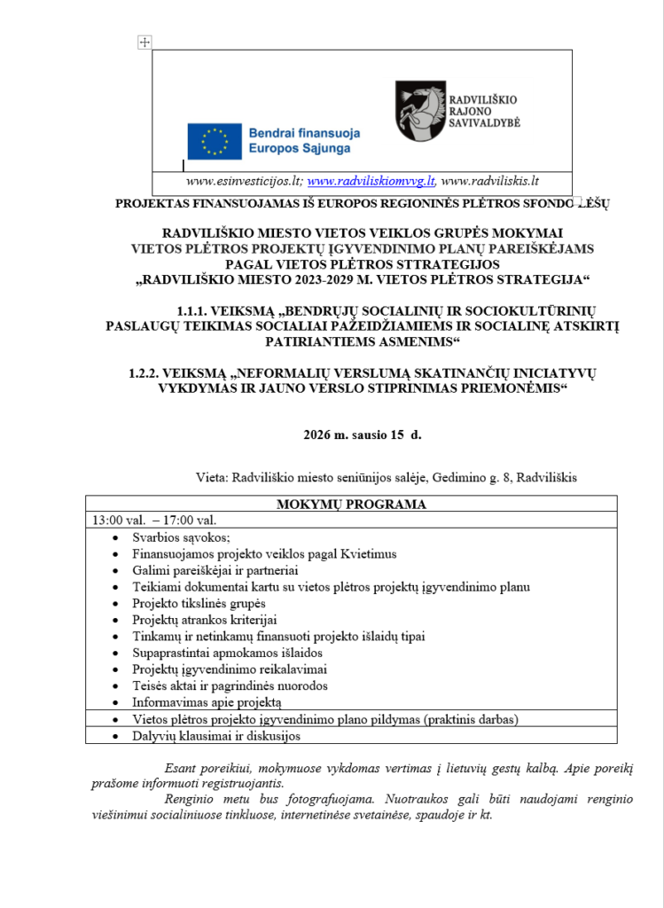 Radviliškio miesto vietos veiklos grupė skelbia kvietimus teikti vietos plėtros projektų įgyvendinimo planus (PĮP) pagal įgyvendinamą vietos plėtros strategiją ,,Radviliškio miesto 2023 – 2029 vietos plėtros strategija”.